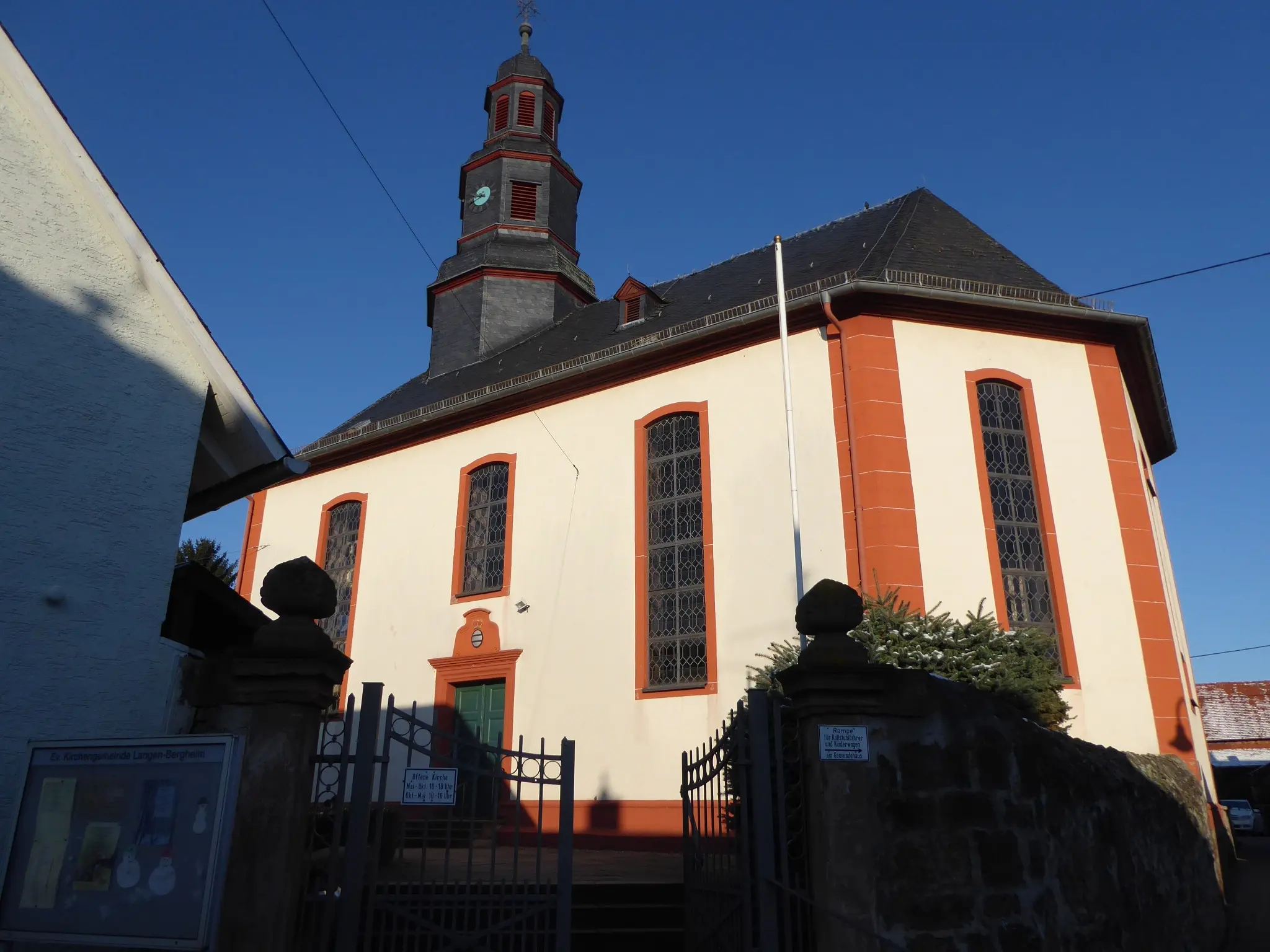 Unsere Kirche ist eine typische evangelische Dorfkirche, wie sie in der ersten Hälfte des 18. Jahrhunderts allein in der südlichen Wetterau neunmal gebaut worden ist: an einen ungeteilten rechteckigen Saalraum schließt ein aus einem Achteck gewonnener dreiseitiger Chor an, der üblicherweise Altar, Taufstein und Orgel aufnimmt. Die Sitzbänke sind hufeisenförmig und mehrgeschossig der Kanzel und dem predigenden Pfarrer zugewandt. Bemerkenswert ist die Größe unserer Kirche: Bergheim hatte zur Zeit des Baues 300 Einwohner! Über dem südlichen Seiteneingang ist das Wappen der Ysenburger Zeichen für den „Fürsteneingang“, der früher für die Landesherrschaft und Honoratioren reserviert war.